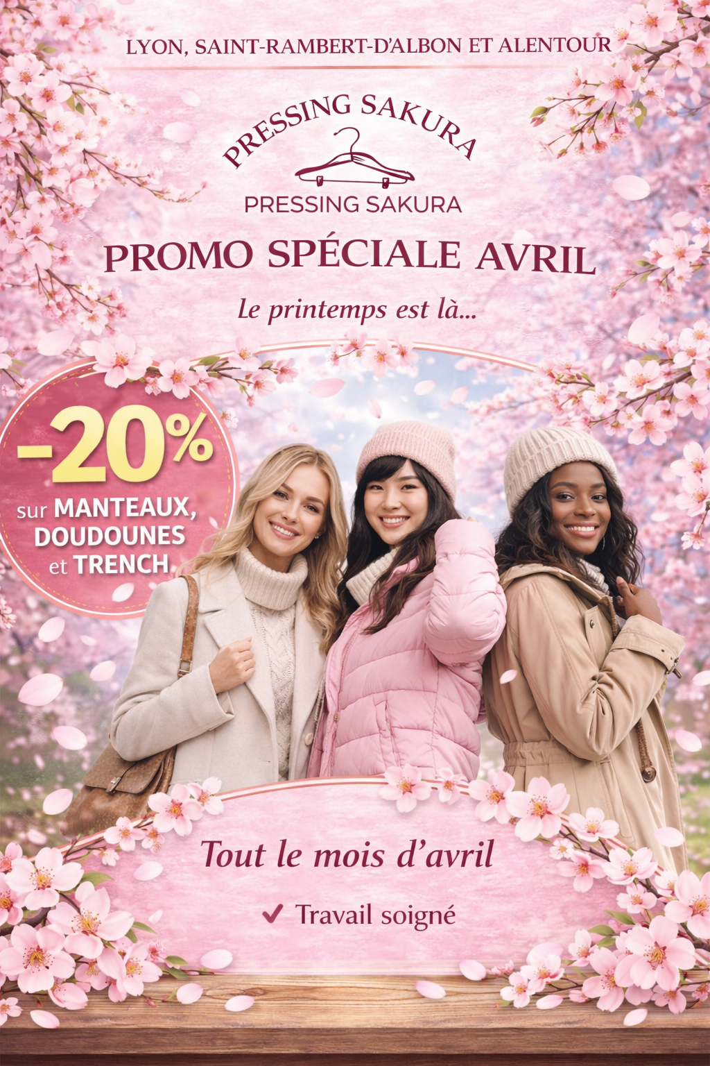 Sous les fleurs de cerisier, vos manteaux, doudounes et trenchs renaissent… à prix tout doux. Valable jusqu'au 30 avril.